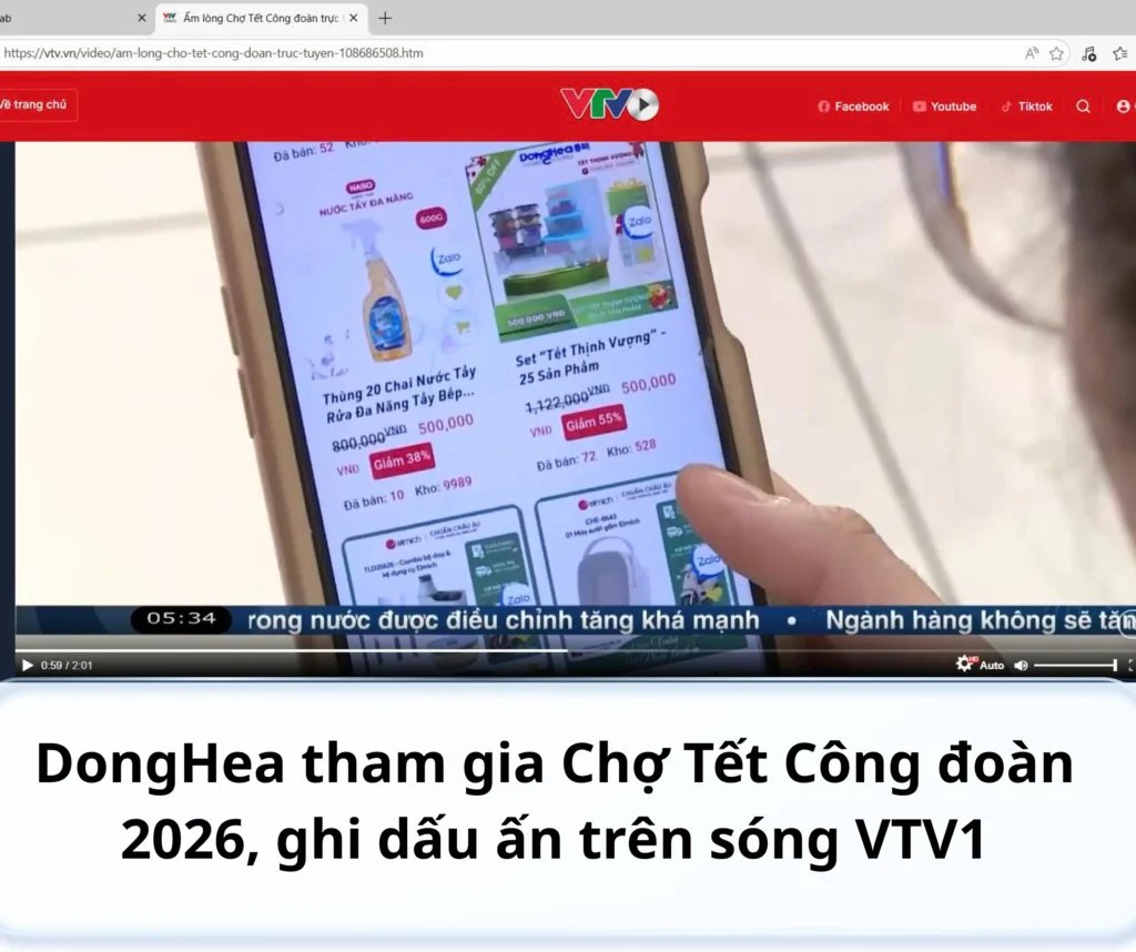 Đáng chú ý, trong phóng sự phản ánh hoạt động của Chợ Tết Công đoàn trực tuyến được phát sóng trên VTV1, hình ảnh sản phẩm DongHea đã xuất hiện khi người lao động trực tiếp lướt chọn hàng hóa trên nền tảng mua sắm của chương trình. Sự hiện diện này cho thấy sản phẩm DongHea đã và đang tiếp cận thực tế đến người tiêu dùng mục tiêu, đồng thời góp phần khẳng định mức độ phù hợp của sản phẩm đối với nhu cầu sinh hoạt hàng ngày của các gia đình Việt.