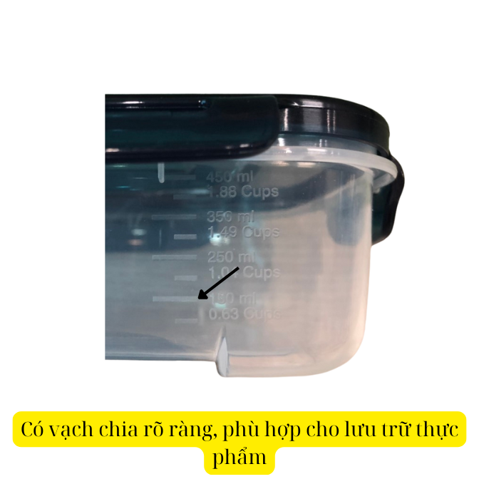 + Vạch chia dung tích rõ ràng trên thân hộp – dễ kiểm soát lượng thực phẩm, phù hợp cho ăn kiêng, chia phần.